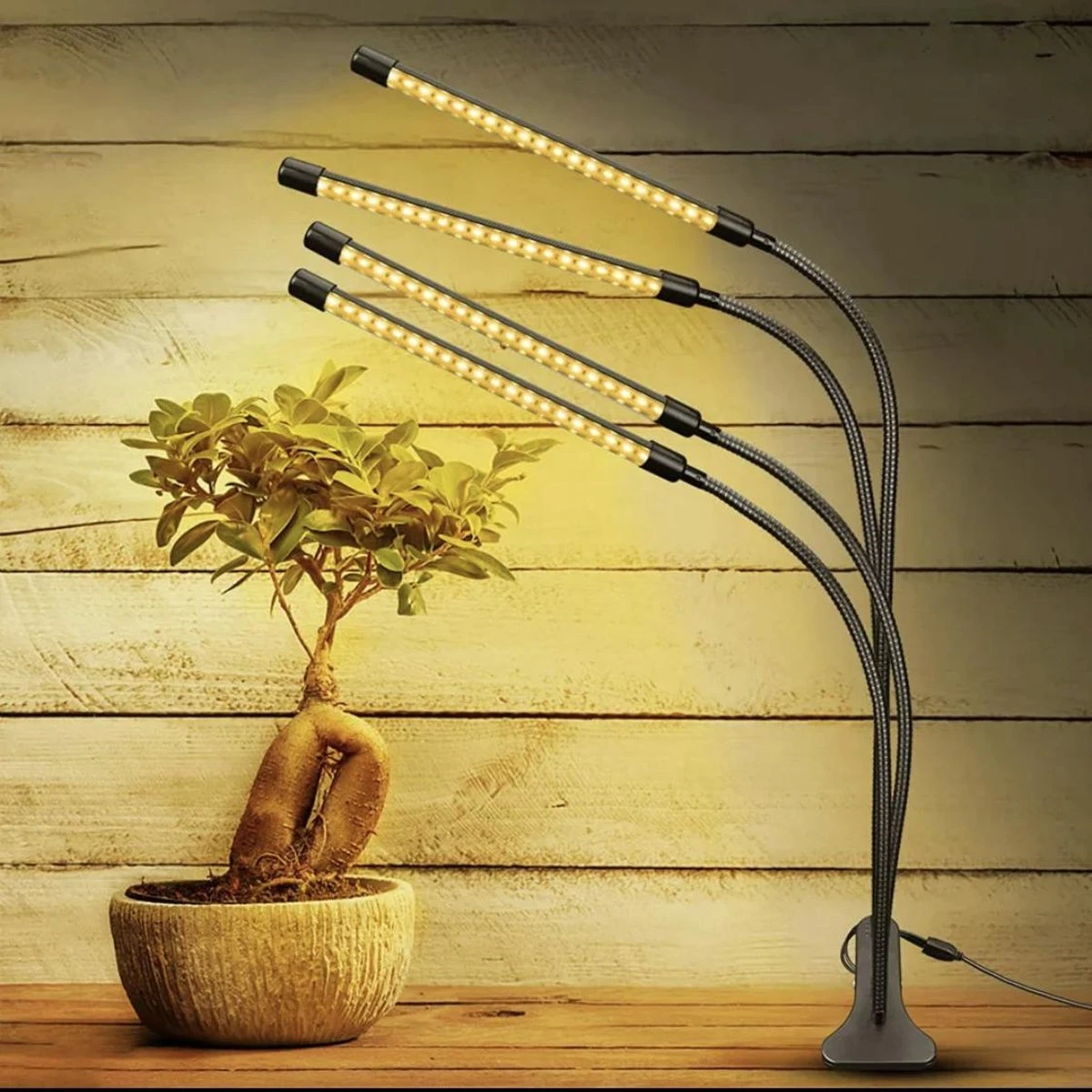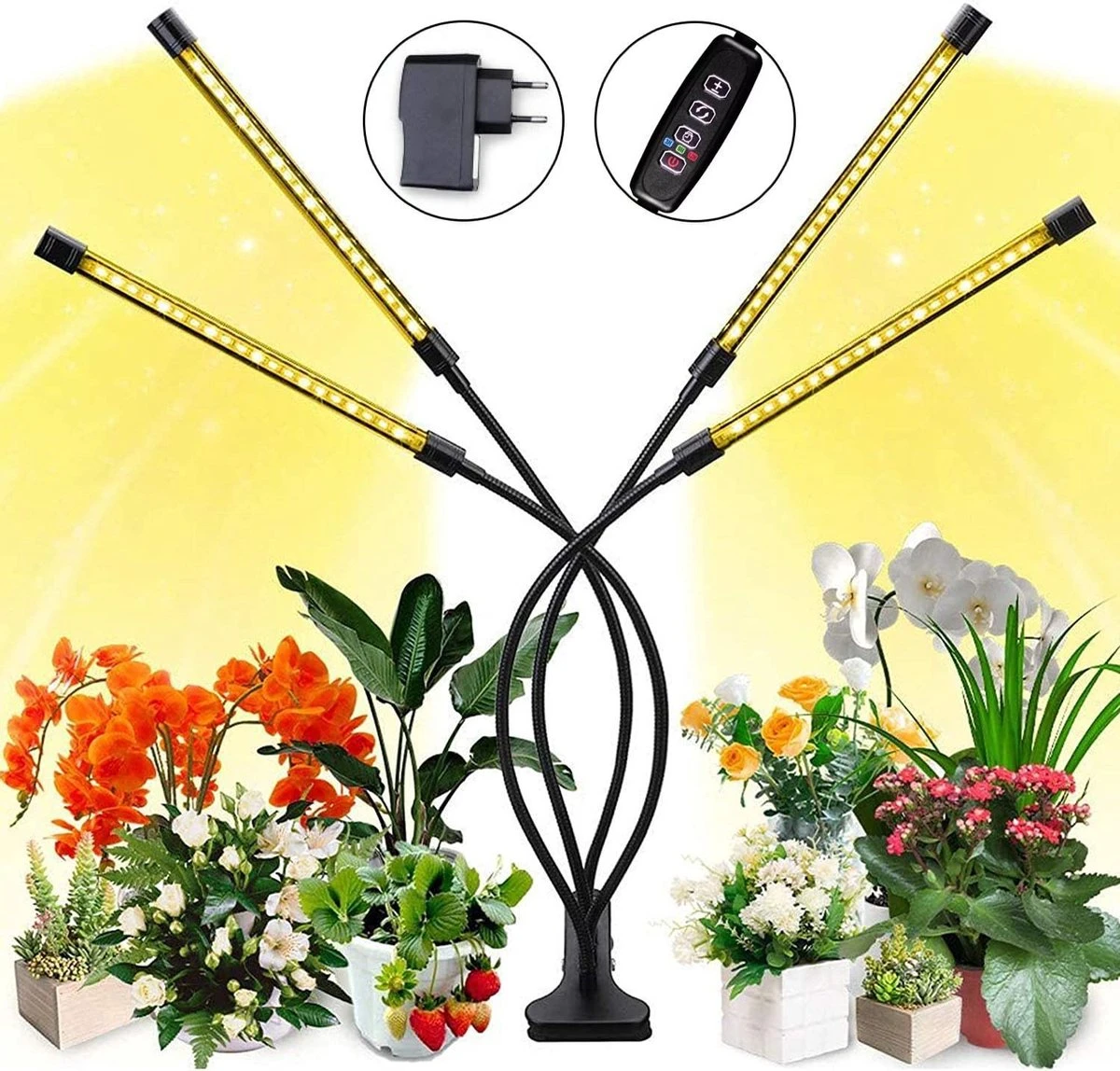 De groeilamp bevat vier stengels met warm witte LED chips die de bloei van gewassen stimuleert