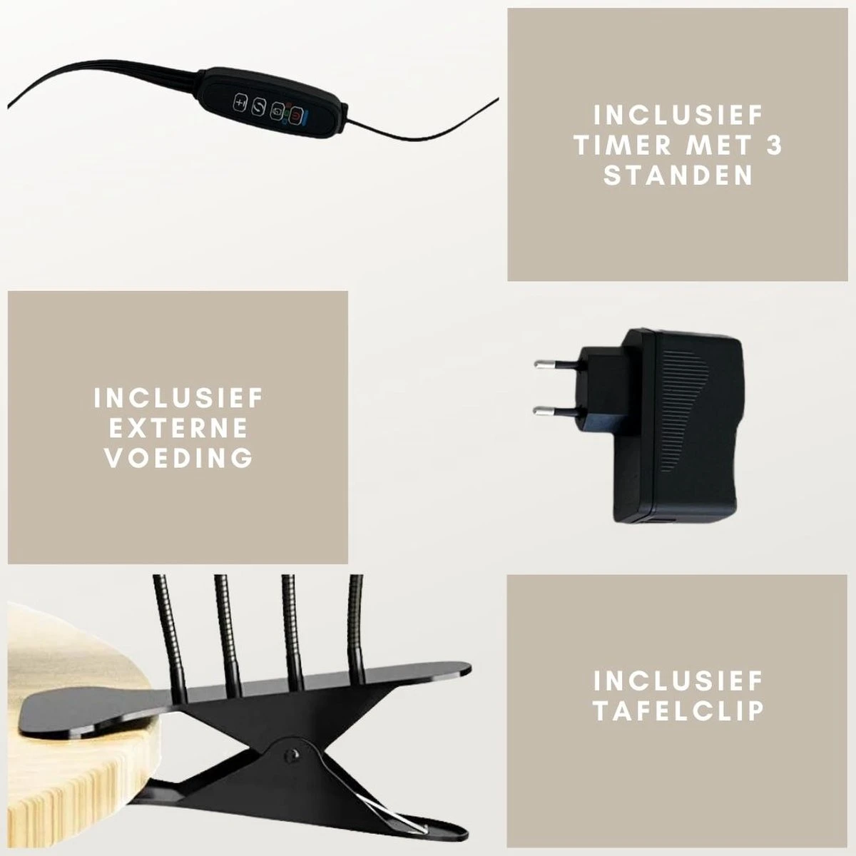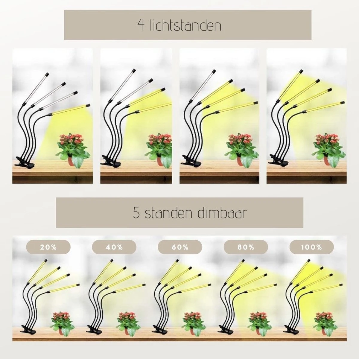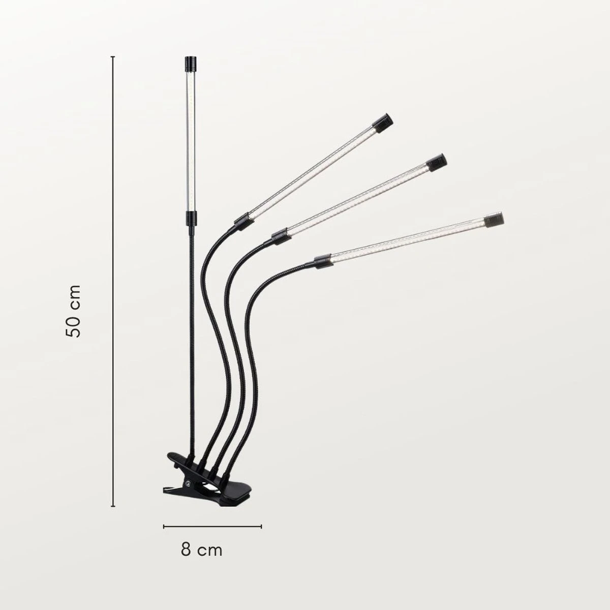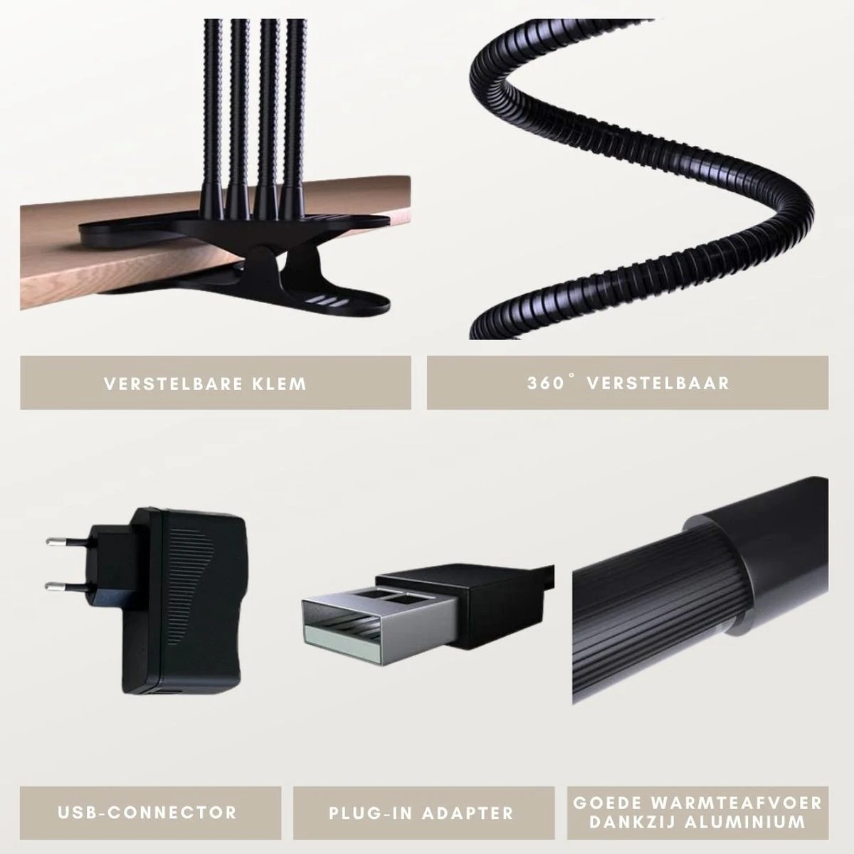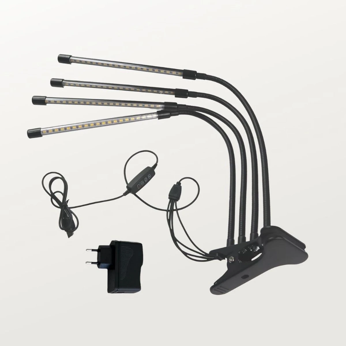 Tevens bevat de groeilamp een USB voeding en tafelclip, om deze te bevestigen aan een tafel.