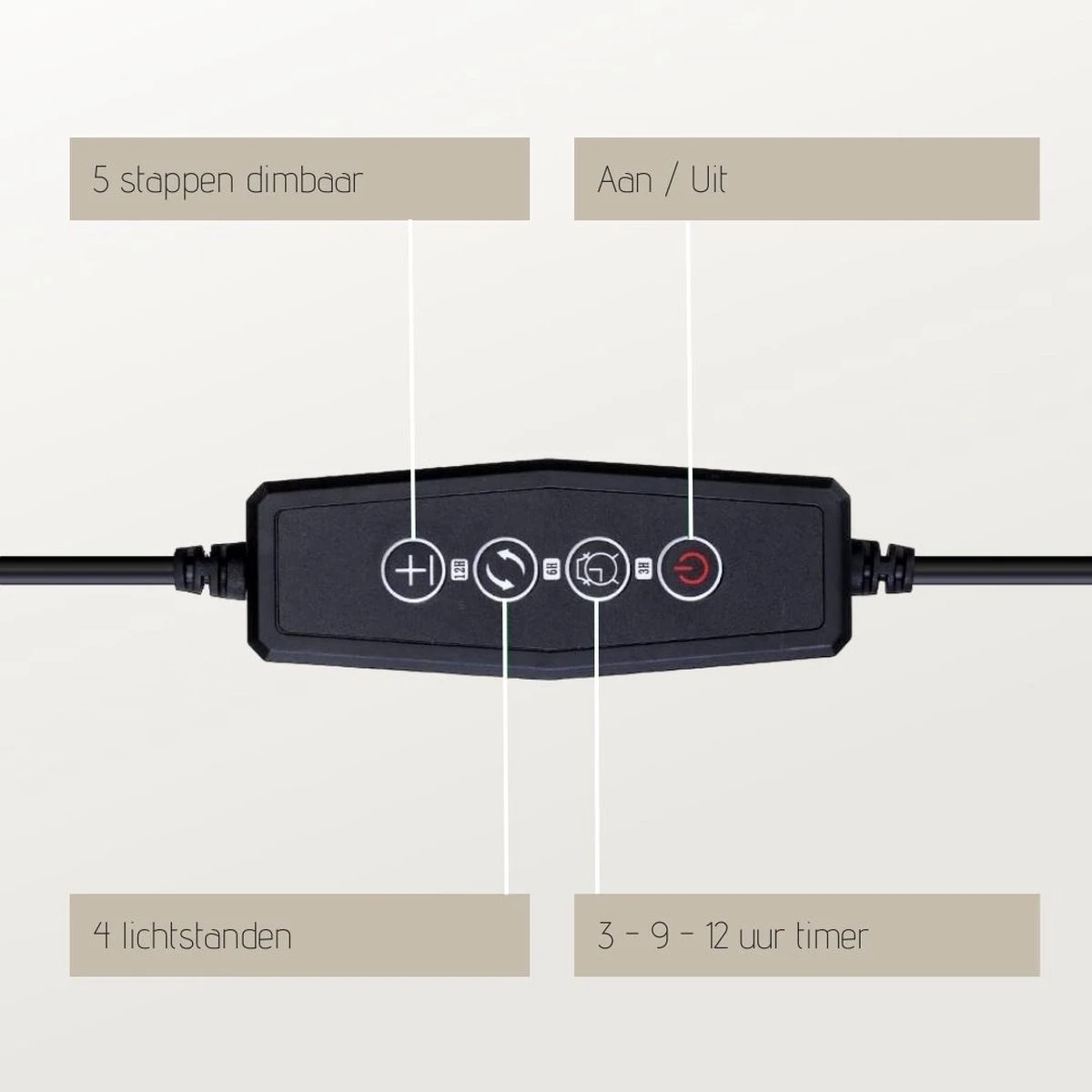 - 5 stappen dimbaar, 4 lichtstanden en 3 standen automatische timer