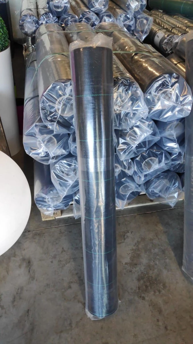 Anti-worteldoeken in uv-gestabiliseerd polypropyleen bandjesweefsel. De dicht geweven doeken laten water door maar houden licht en wortels tegen.