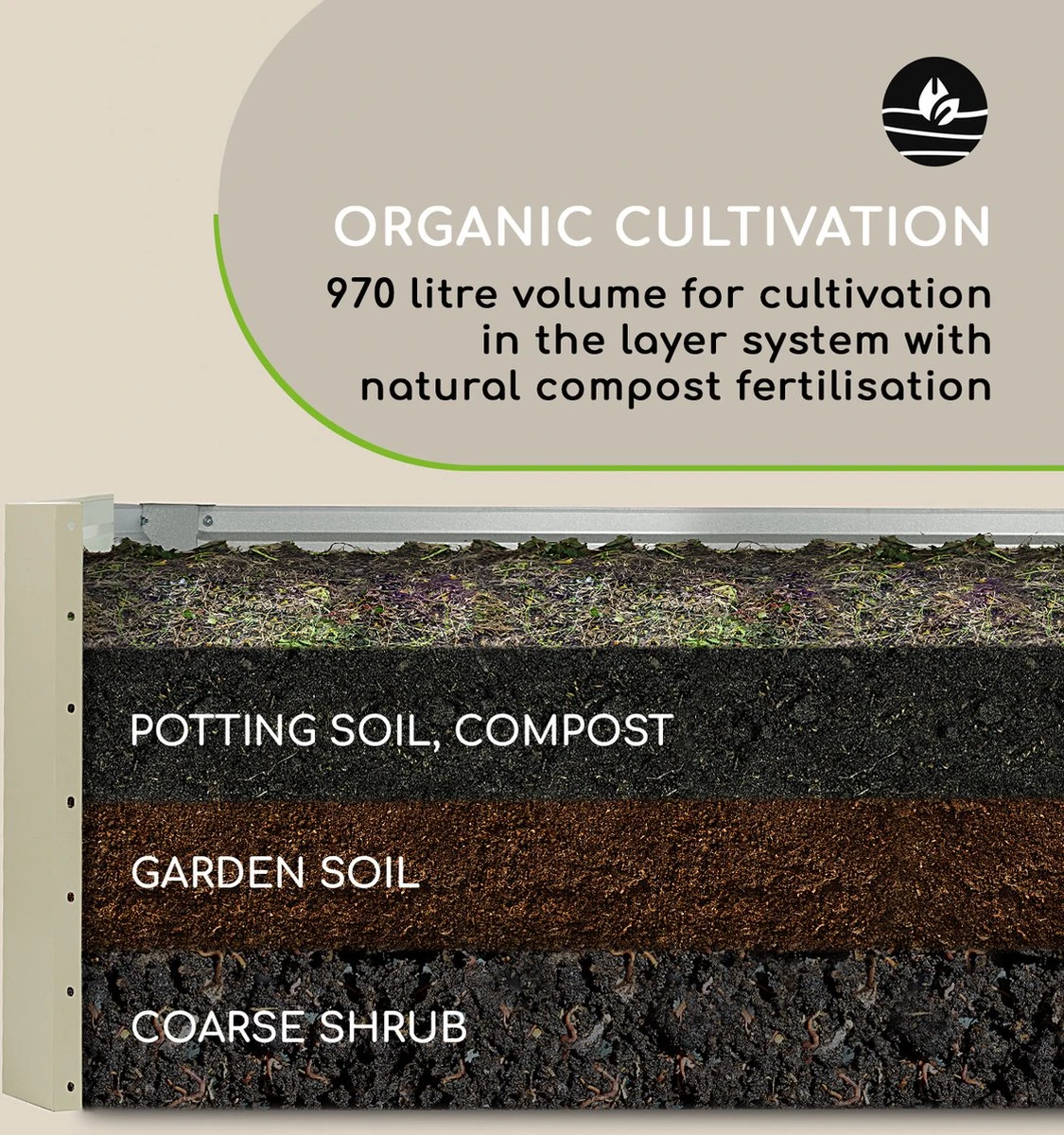 Een bontgekleurd feest voor de ogen en gezond plezier voor uw smaakpapillen: Met de Blumfeldt High Grow Straight worden optimale groeiomstandigheden gecreëerd. Dit maakt in vergelijking grotere opbrengsten mogelijk dan met een platte moestuin. Comfortabel blijven staan ontziet de rug en maakt tuinieren aanzienlijk leuker. De werkhoogte van 60 cm is daarnaast een flinke hindernis voor ongedierte zoals slakken. Met zijn volume van 970 liter zijn talrijke humuslagen aan te brengen – dit lokt niet alleen grondomwoelende regenwormen aan maar voorziet de bak tevens duurzaam van verse voedingsstoffen.