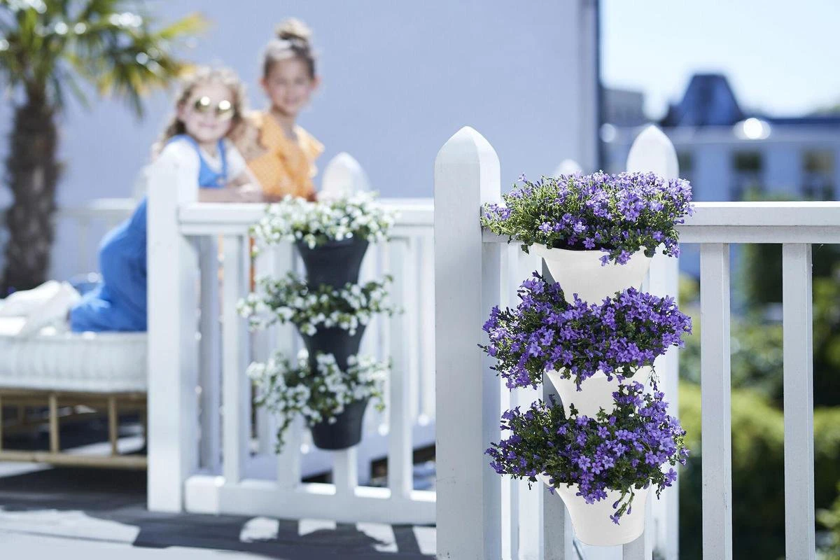 Als jouw terras of balkon niet groot of groen genoeg is, ga jij gewoon heel creatief de hoogte in! Ga verticaal tuinieren en combineer eindeloos veel planten en bloemen met elkaar op je balkon, terras, muur of schutting. De set met 3 potten wordt standaard geleverd met balkon- en muurhaken en is dus overal te plaatsen. De potten zijn voorzien van een handig overlooppijpje. Zo staan je plantjes nooit te nat, zijn ze beschermd tegen wortelrot en worden de plantwortels perfect belucht. Kun jij nog langer van ze genieten!