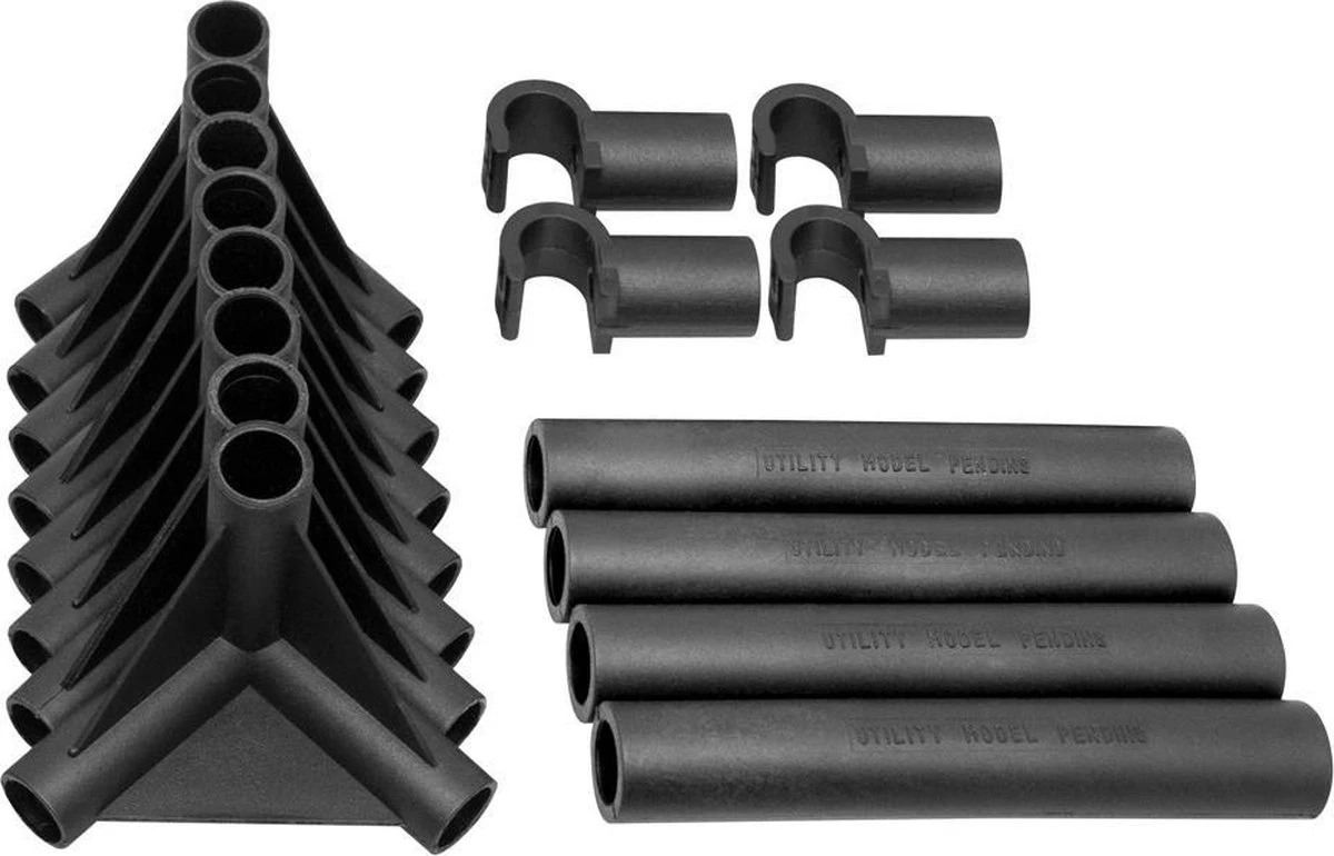 Het vierhoekige frame, gemaakt van holle aluminium buizen, is eenvoudig in elkaar te zetten door de buizen in de verschillende meegeleverde kunststof verbindingen te steken. (Ze kunnen als afzonderlijke sets worden gekocht als er ooit een verloren gaat.)