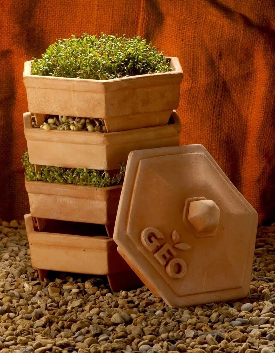 De gebakken klei kan tot 10% van zijn gewicht aan water opnemen en geeft die vervolgens door aan de kiemen. De GEO Terracotta bestaat uit 3 zeshoeks kiemlagen met een innovatief ruimte systeem. Hiermee kunt u de licht- en luchttoevoer eenvoudig regelen, voor het perfecte kiemklimaat.