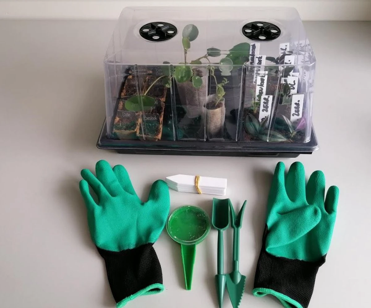 Deze zwarte kweekbak oftewel met een mooi woord propagator is een ideaal kweekkasje voor het kweken van kruiden of het laten ontkiemen van zaadjes binnens- en buitenshuis. Met zijn afmetingen van 20 x 24 x 37 centimeter past hij gemakkelijk op de vensterbank of op een ander zonnig plekje. Zet hem in de keuken zodat je altijd kunt genieten van verse kruiden zoals peterselie, basilicum, munt en andere eetbare planten. Met de handige tools kun je direct aan de de slag!