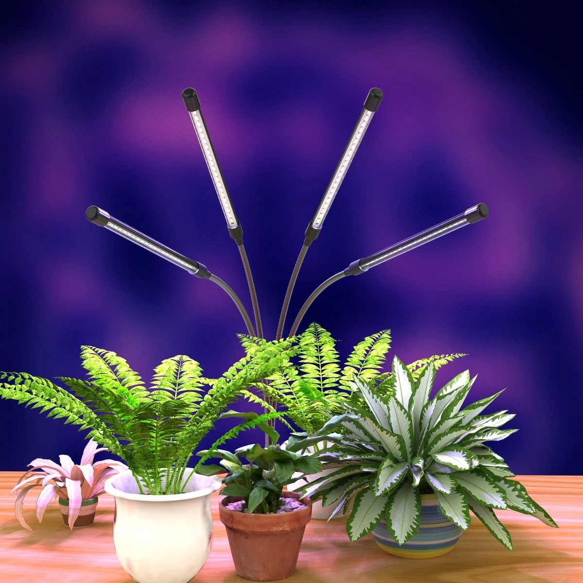 De groeiverlichting is geprogrammeerd om de volgende lichtkleuren afzonderlijk aan te zetten: blauw, rood en paars.