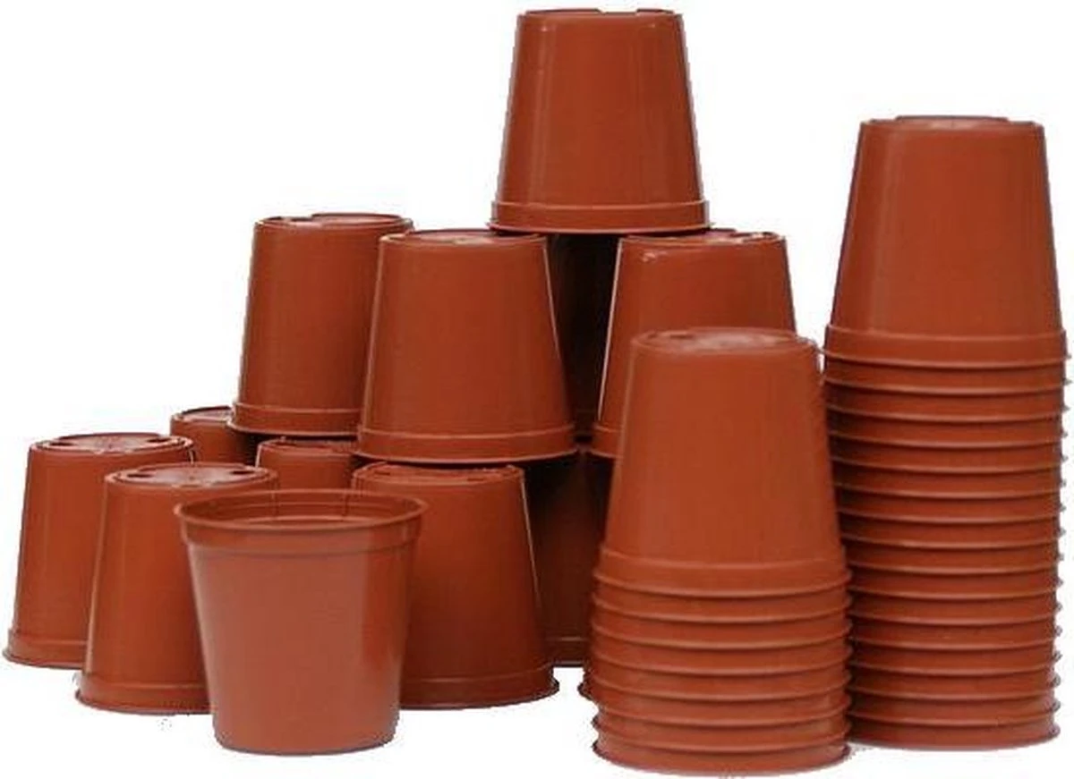 Oranje ronde potten met een eersteklas bodem voor optimale afwatering en ventilatie, ook voor irrigatie met irrigatiematten. Kwalitatieve plastic kweekpotten die verscheidene keren kunnen worden hergebruikt.