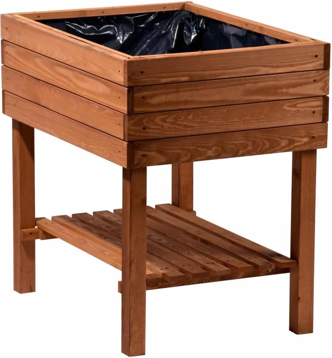 Deze stevige bak is gemaakt van Europees grenenhout van 15 mm en is bedekt met een weerbestendige, amberkleurige beschermlaag. De meegeleverde plantfolie maakt een snelle en ongecompliceerde beplanting van de bak mogelijk. Daarnaast biedt de grote opbergruimte onder de plantenbak veel opbergruimte voor bijvoorbeeld gieters, potgrond of tuingereedschap.