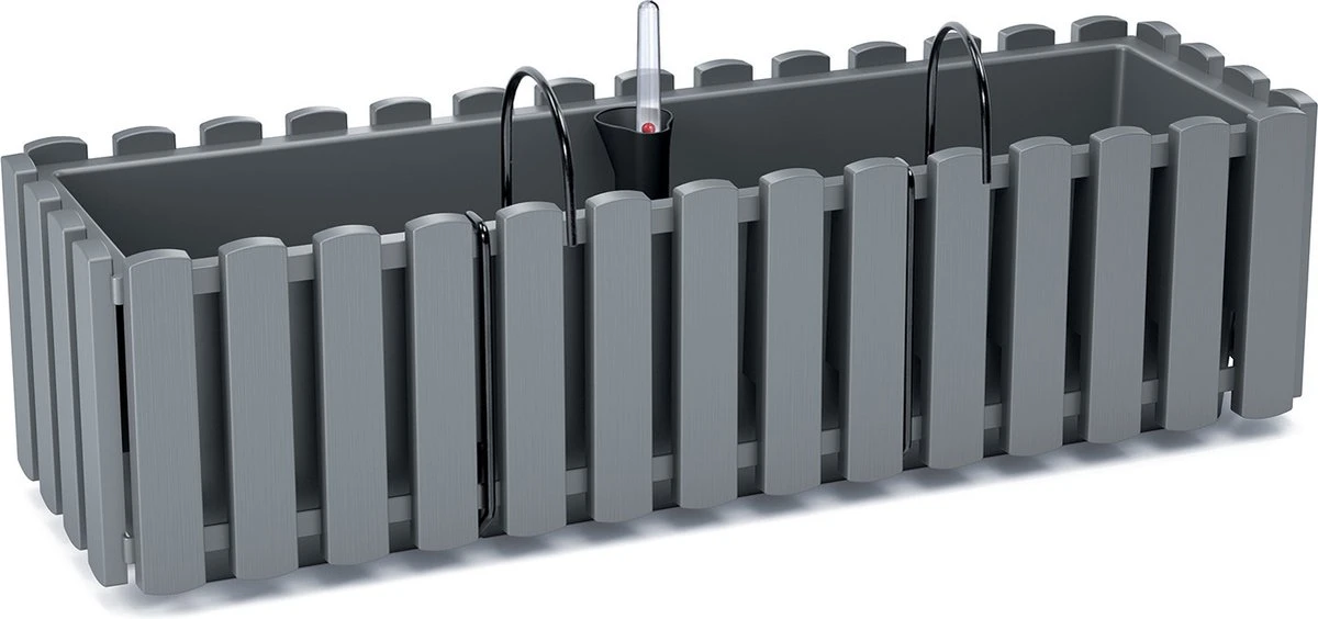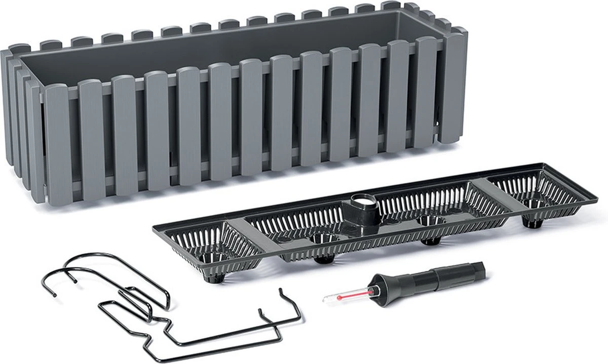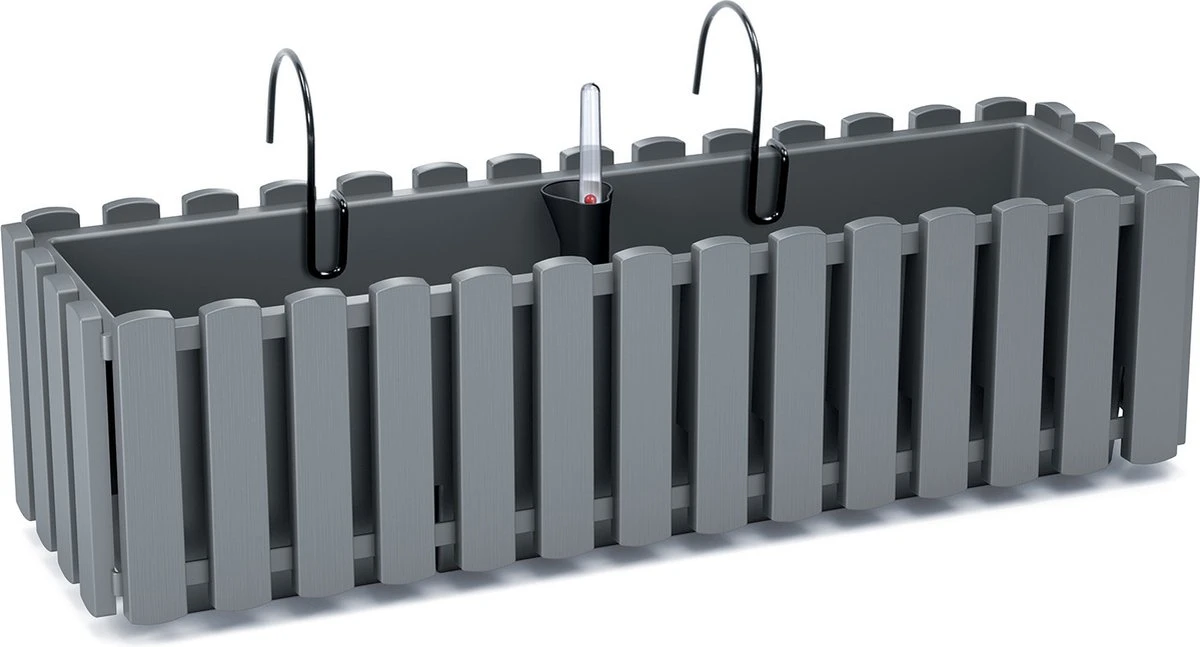 Fence-look ophang plantenbak/bloembak kunststof 58 x 18 x 16 cm steengrijs. Om aan de schutting, railing of wand op te hangen met de bijgeleverde beugels. Vorstbestendig ja. Stijlvolle plantenpotten/bakken voor in de tuin of op het balkon.