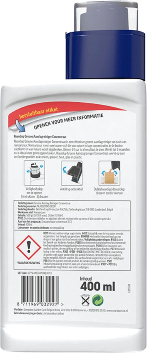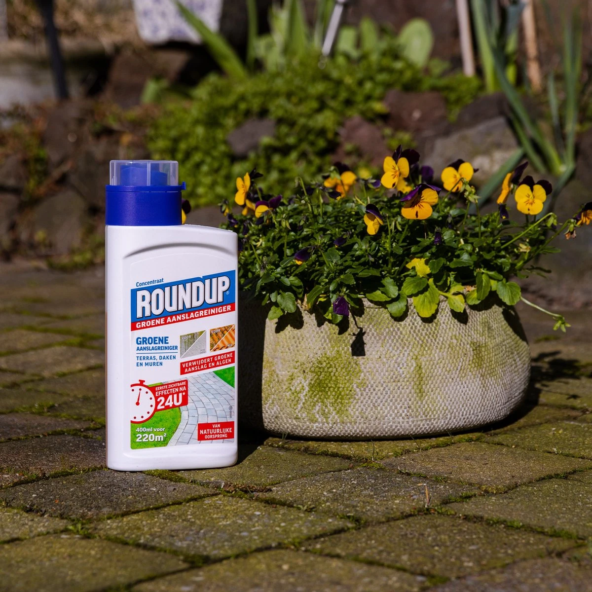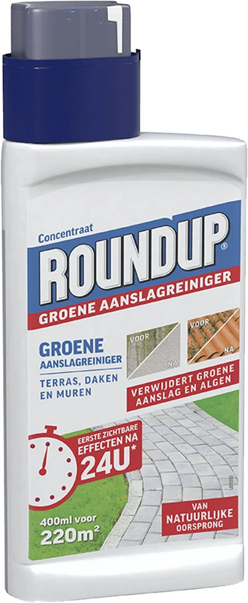 Roundup® Groene Aanslagreiniger Concentraat 400ml is een effectieve groene aanslagverwijderaar op basis van nonaanzuur. Nonaanzuur is een werkzame stof die van nature in lage concentraties in de bodem voorkomt en van nature wordt afgebroken. Binnen 24 uur is al resultaat te zien. Werkt tot 6 maanden en is ideaal voor grote oppervlakken. Roundup ® Groene Aanslagreiniger Concentraat werkt op zeer veel ondergronden zoals steen, graniet, hout, glas en plastic.